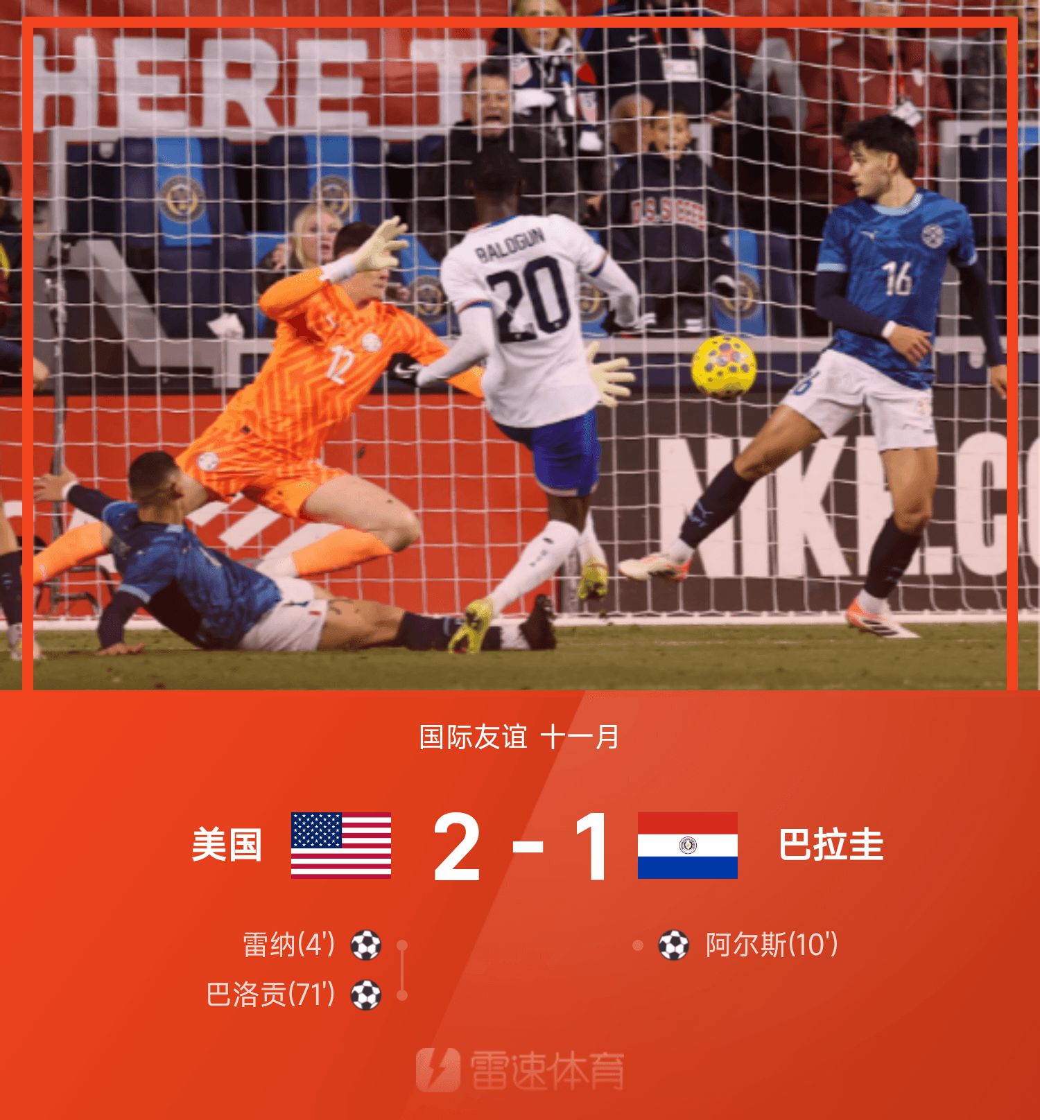 6686 Sports รายงานเมื่อวันที่ 16 พฤศจิกายนว่านัดกระชับมิตรระหว่างประเทศเปิดฉากดวลกัน เจ้าบ้านสหรัฐฯ พบกับปารากวัย สำหรับทีมสหรัฐอเมริกา บาโลกุนและเรน่าทำประตูตามลำดับ ในขณะที่ปารากวัย อัลส์ทำประตูแต่ไม่สามารถเซฟเกมได้ สุดท้ายสหรัฐฯ เอาชนะ ปารากวัย 2-1