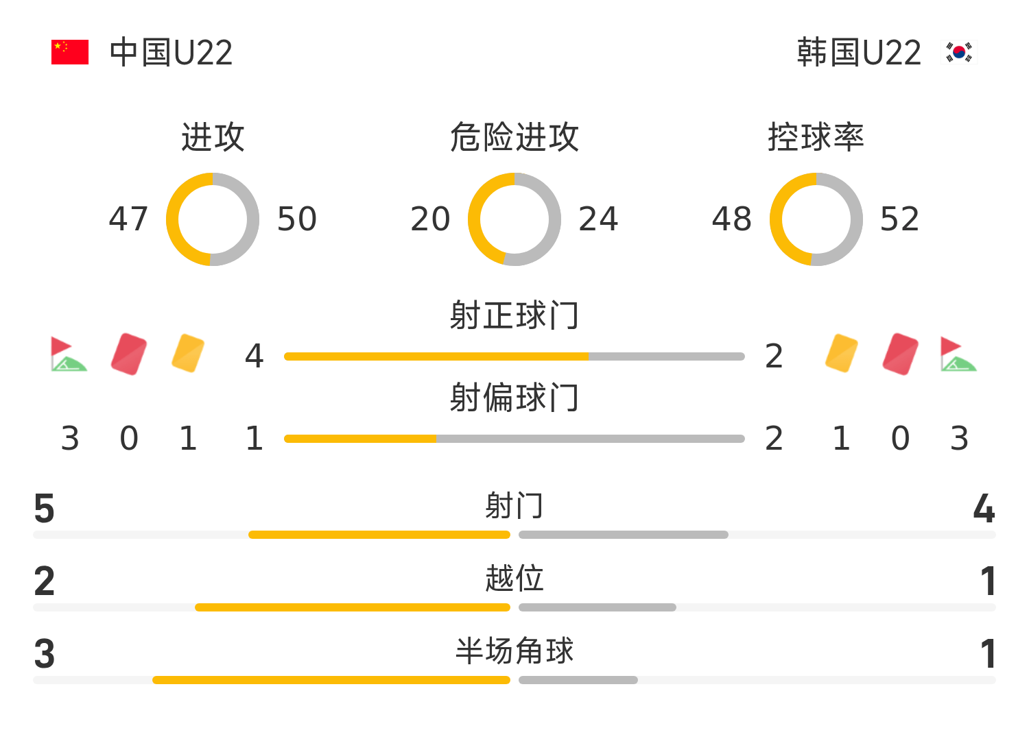 เกาหลีใต้ รายชื่อตัวจริง U22: 1-เหวิน ซวนห่าว, 24-จาง โชฮวน (82'20- ปาร์ค ซึง-ฮุน), 22-พัค จุน-ซู (82'5-โช ฮยอน-แท), 4-ดิง ซึง-แบ (67'7-ปาร์ค ซึง-โฮ), 23-ชิน มิน-ฮา, 17-ลี คุน-ฮี, 2-คัง มิน-จุน, 16-ปาร์ค ฮยอนบิน, 8-คิม ดงจิน, 19-คิม ยงฮัก (68'11-คัง ซอง-จิน), 18-เจิ้ง ซาซัง (68'9-คิม มิงจุน)