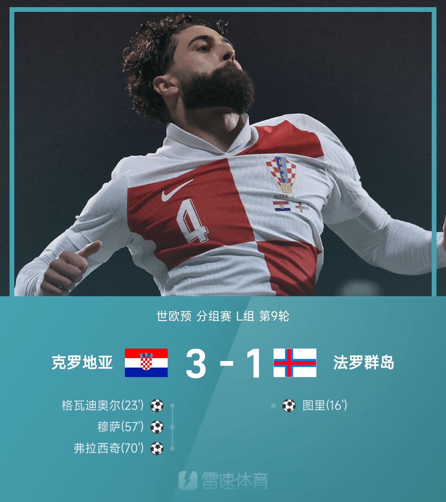 6686 ข่าวกีฬาเมื่อวันที่ 15 พฤศจิกายน ในรอบที่ 9 ของกลุ่ม L ของเกมรอบคัดเลือกโลกยุโรปครั้งที่ 26 โครเอเชียเอาชนะหมู่เกาะแฟโร 3-1 ตลอดทั้งเกม ทูริ ยิงประตูช่วยให้ทีมเยือนหมู่เกาะแฟโรขึ้นนำ จากนั้นกวาดิโอล, มุสซ่า และวลาซิชก็ทำประตูติดต่อกันเพื่อพลิกกลับให้สมบูรณ์ โมดริชถูกเปลี่ยนตัวออกในนาทีที่ 61 และโครเอเชียผ่านเข้าสู่ฟุตบอลโลก
