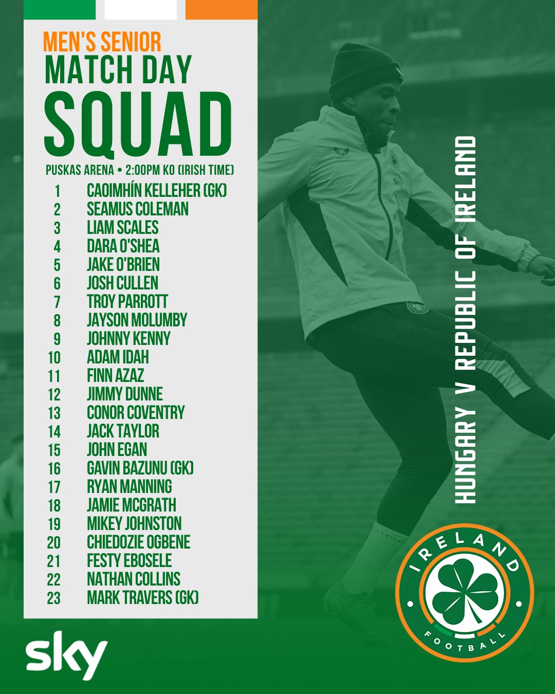 6686 Sports รายงานเมื่อวันที่ 16 พฤศจิกายนว่าคืนนี้ในกลุ่ม F ของการแข่งขันชิงแชมป์ยุโรปโลก ทีมเยือนจากไอร์แลนด์จะพบกับฮังการี ก่อนเกม โซเชียลมีเดียอย่างเป็นทางการของทีมไอริชได้เปิดเผยรายชื่อสำหรับรอบนี้: