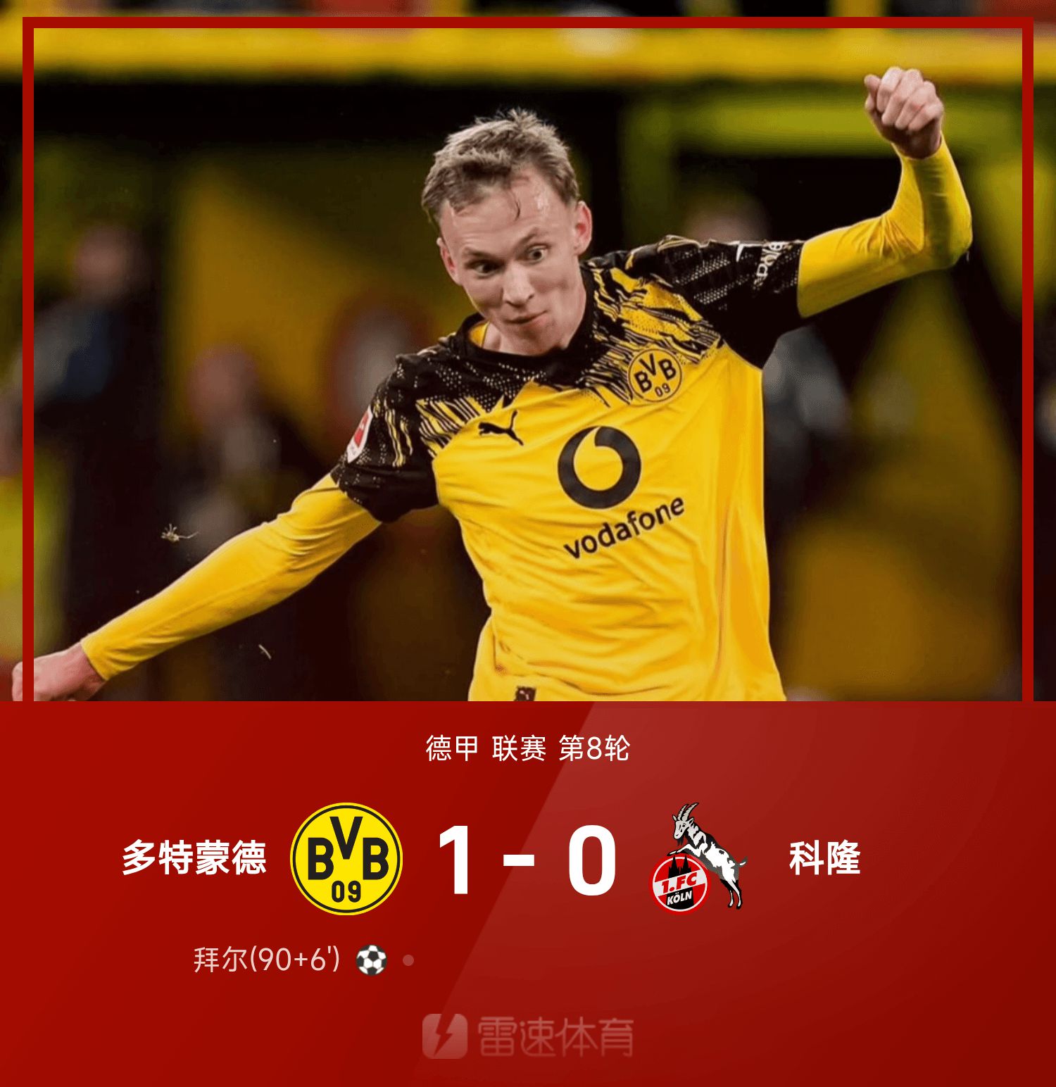 รายงานการแข่งขันบุนเดสลีกา: สกิวเบอร์เซฟได้เยี่ยมหลายครั้ง, ไบเออร์ยิงสุดท้ายในช่วงทดเวลาบาดเจ็บ, ดอร์ทมุนด์ 1-0 โคโลญจน์