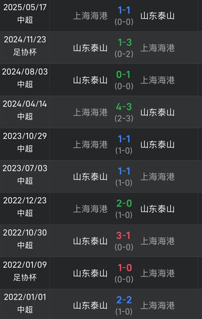 ในการเผชิญหน้า 10 ครั้งล่าสุดระหว่างทั้งสองฝ่ายในไชนีสซูเปอร์ลีก ไท่ซานชนะ 3 เสมอ 4 และแพ้ 3 และทั้งสองฝ่ายเท่าเทียมกัน อย่างไรก็ตาม ชัยชนะทั้ง 3 ครั้งของไท่ซานนั้นยังห่างไกลนัก โดยเกิดขึ้นในปี 2019, 2021 และ 2022 ตามลำดับ