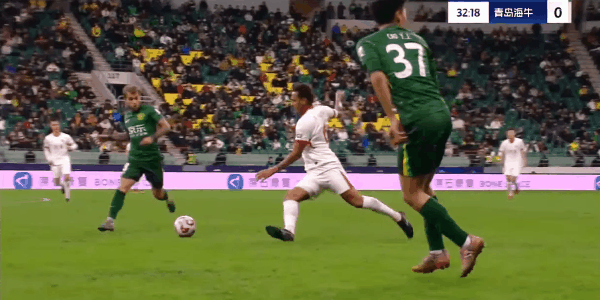 18' พะยูนจ่ายบอลจากขวาเข้าประตู เหอหยูเผิงไล่ตามกลับมาและมีส่วนสกัดบอลสำคัญ