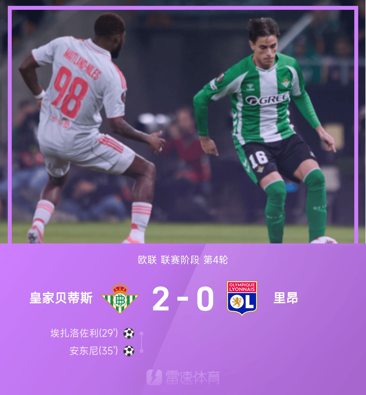 6686 ข่าวกีฬาวันที่ 7 พฤศจิกายน ในรอบที่สี่ของยูโรปาลีก 25/26 เรอัล เบติส เผชิญหน้ากับลียง นาทีที่ 29 ของครึ่งแรก บาคัมบูช่วยเอซซารอซโซลีทำประตู เรอัล เบติสขึ้นนำ นาทีที่ 35 ร็อกก้าได้เตะฟรีคิกและจ่ายบอล แอนโทนี่ยิงอย่างสงบด้วยการยิงนัดเดียวเปลี่ยนสกอร์เป็น 2-0 ไม่มีทีมใดทำผลงานได้สำเร็จในครึ่งหลัง สุดท้ายเรอัล เบติส เอาชนะ ลียง 2-0 ในบ้าน