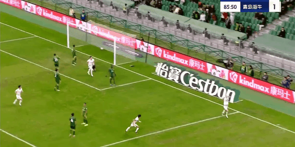 18' พะยูนจ่ายบอลจากขวาเข้าประตู เหอหยูเผิงไล่ตามกลับมาและมีส่วนสกัดบอลสำคัญ
