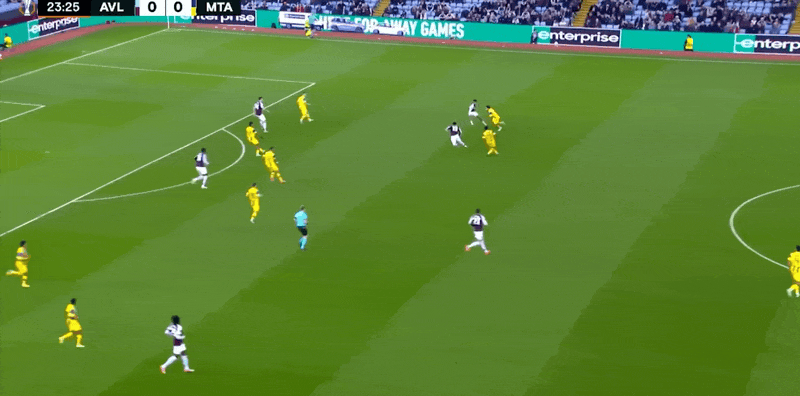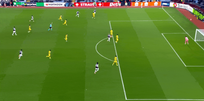 รายชื่อผู้เล่นตัวจริงของแอสตัน วิลล่า: 23-Martinez, 3-Lindelof, 4-Konsa, 14-Torres, 22-Mattson, 19-Sancho, 24-Onana, 29-Gaisan, 27-Rogers, 2 6-โบการ์ด, 17-มัลเลน