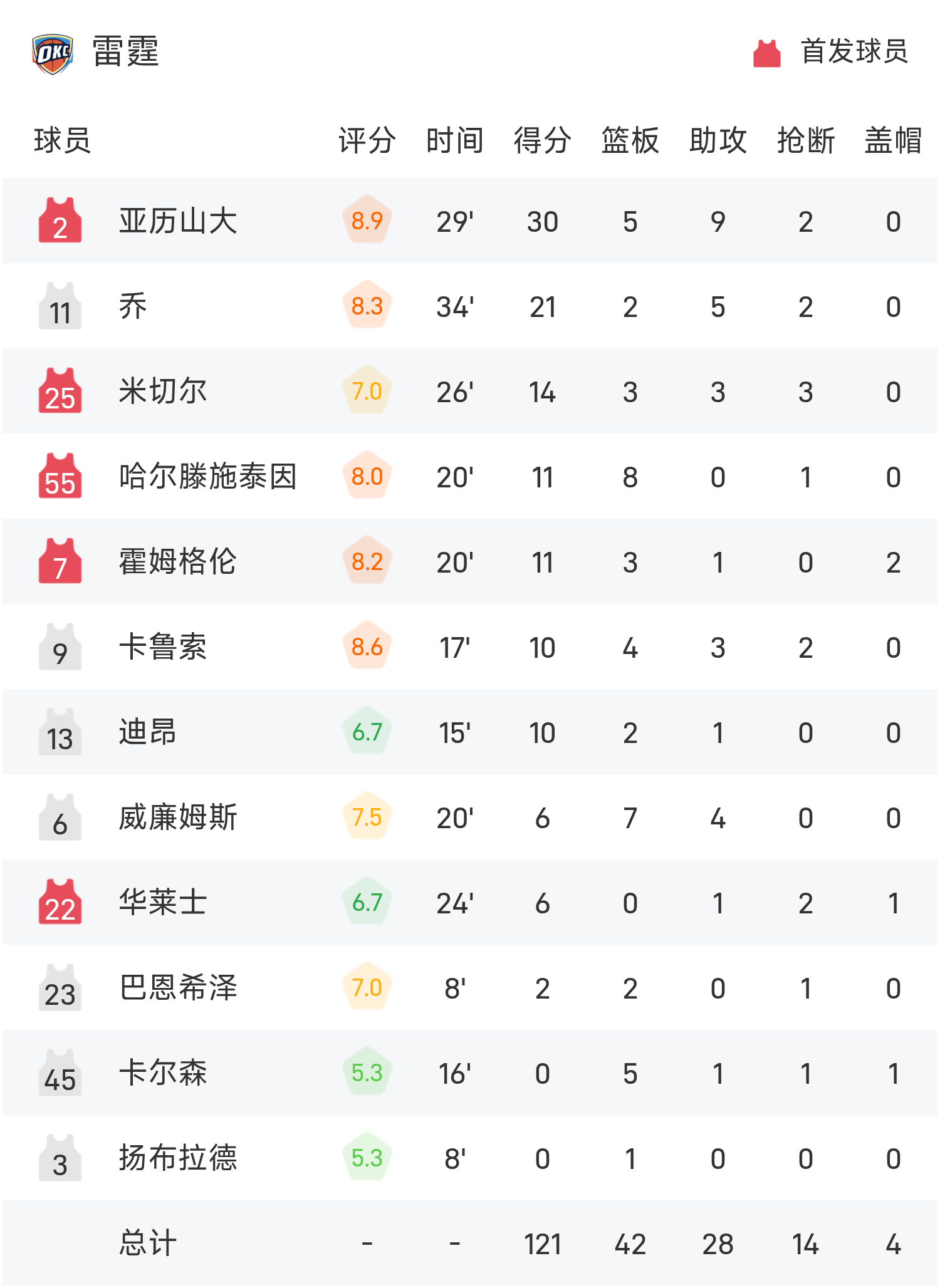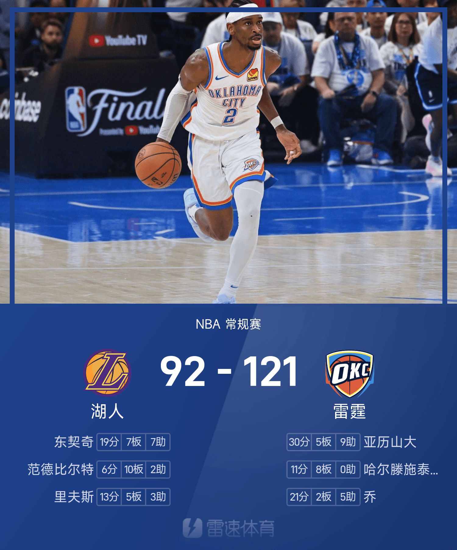 รายงานของ NBA: อเล็กซานเดอร์มี 30 แต้ม 9 แอสซิสต์ ธันเดอร์เอาชนะเลเกอร์ส 121-92