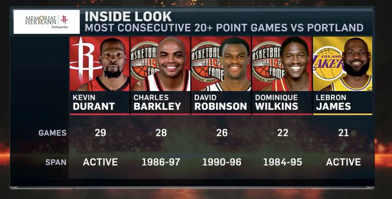 ดูแรนท์ยิงได้ 8 จาก 12 ครั้งในครึ่งแรกและทำคะแนนได้ 20 แต้ม โดยทำคะแนนได้มากกว่า 20 แต้มเมื่อเทียบกับเทรลเบลเซอร์สใน 30 เกมติดต่อกัน