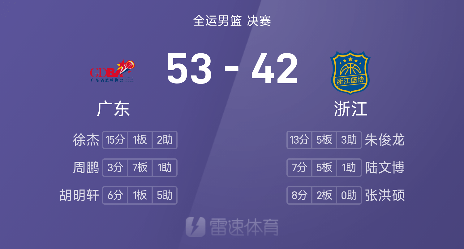 บาสเก็ตบอลชายรอบชิงชนะเลิศกีฬาแห่งชาติ พักครึ่ง: จู จุนหลง 13+5, ซูเจี๋ย 15 แต้ม, กวางตุ้ง 53-42 เจ้อเจียง
