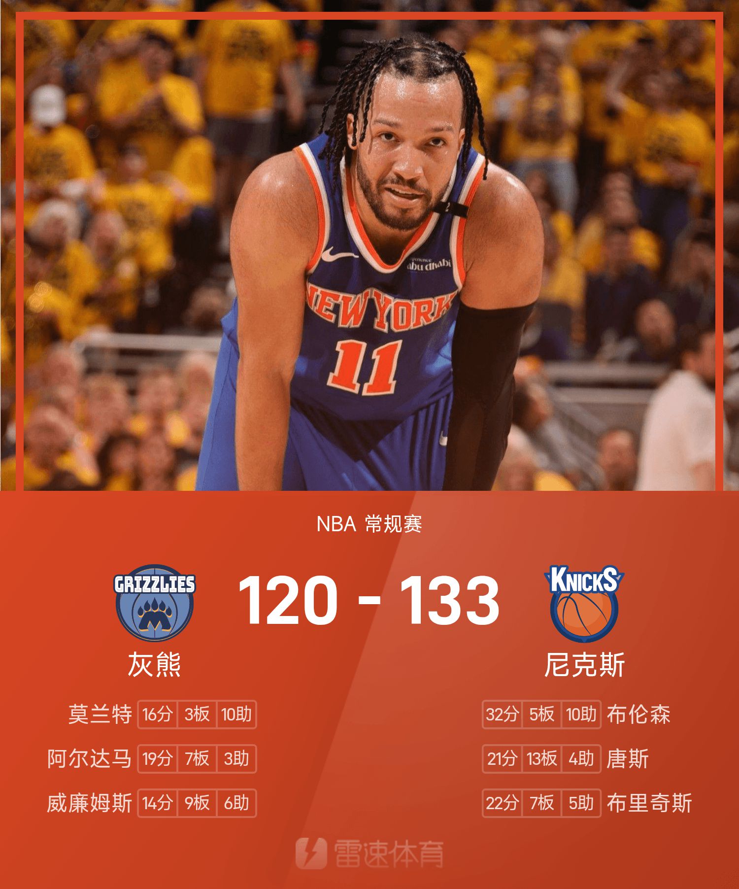 บรันสันทำคะแนน 32 แต้มและ 10 แอสซิสต์ นำทีมเหย้าของ Knicks คว้าชัยชนะรวด 7 เกม