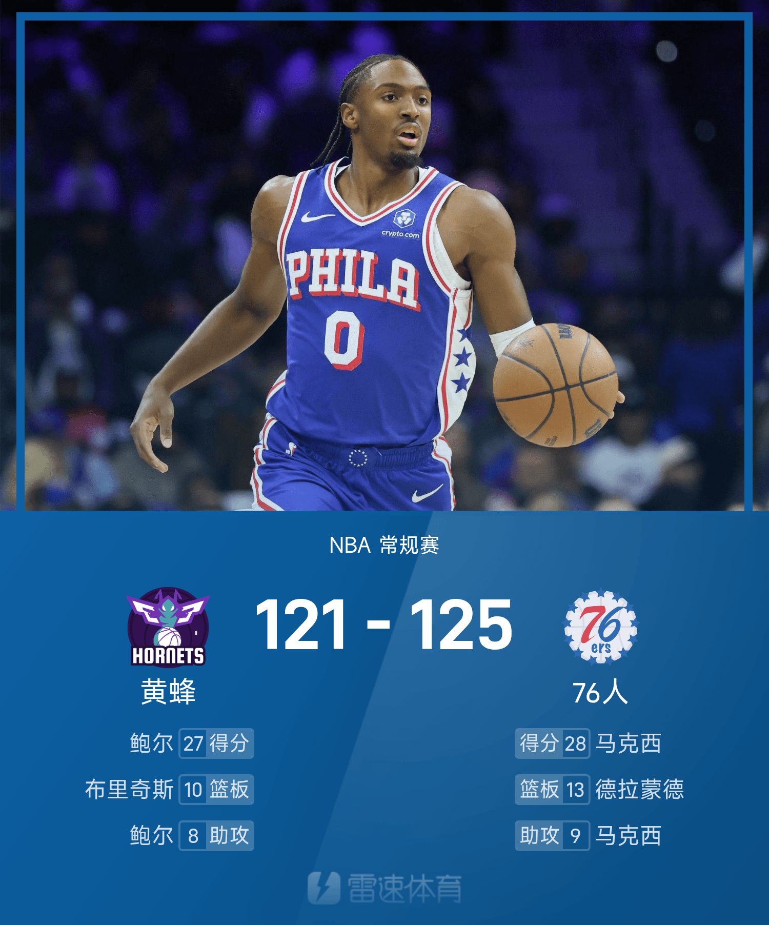 รายงานเกม NBA แม็กซี่มี 28 แต้ม 9 แอสซิสต์ 76ers เอาชนะ ฮอร์เน็ตส์ 125-121 อย่างหวุดหวิด