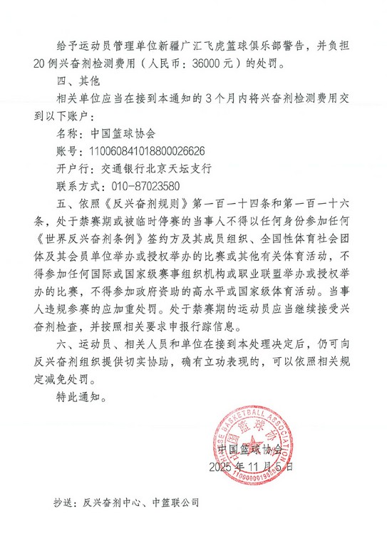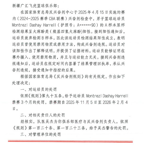 6686 ข่าวกีฬา เมื่อวันที่ 6 พฤศจิกายน สมาคมบาสเกตบอลจีนประกาศว่าตัวอย่าง A ของอดีตการช่วยเหลือบาสเกตบอลชายของซินเจียง Harrell มีผลการทดสอบในเชิงบวกสำหรับสารแคนนาบิไดออล และเขายกเลิกการทดสอบตัวอย่าง B ซึ่งเป็นการละเมิด ในที่สุดก็มีการออกการระงับ 3 เดือน (5 พฤศจิกายน 2568 ถึง 4 กุมภาพันธ์ 2569)