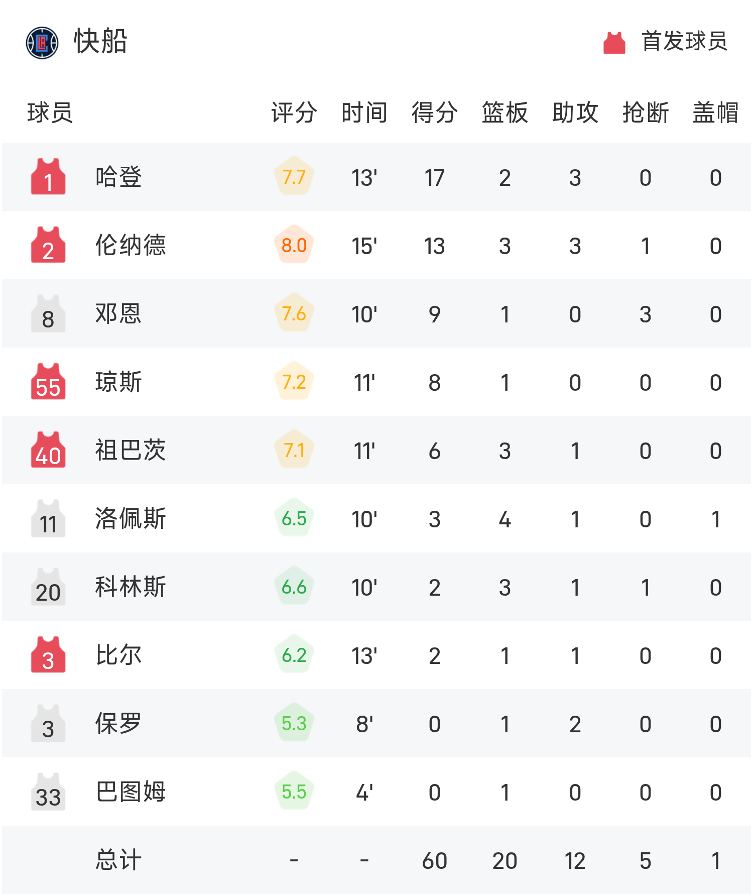ฮาร์เดนทำสามพอยน์เตอร์ได้ 5 จาก 6 ครั้งและทำคะแนนได้อย่างมีประสิทธิภาพ 26 แต้ม 3 รีบาวน์และ 4 แอสซิสต์ บุ๊คเกอร์ทำได้แค่ 8 แต้มเท่านั้น คลิปเปอร์ส 72-56 ซันส์ในช่วงพักครึ่ง